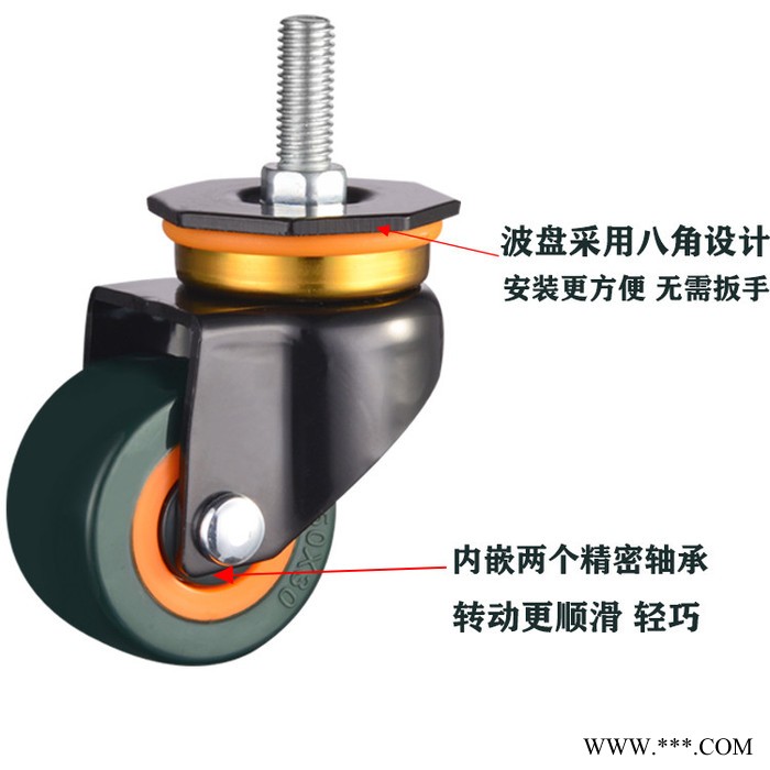 單輪載重 100KG 2.軸承為 軸承鋼雙軸承 靈活敏捷 3.支架表面處理 電泳 鍍鉻 掛黃鋅 更加防銹 時尚美觀