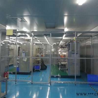 1.潔凈棚結構:材料以40x40或40x80mm工業鋁型材作為框架,采用風機濾網送風單元FFU送風,四周用防靜電垂簾或防靜電有機玻璃,頂部鋪蓋密封盲板,形成一個密閉區,內部凈化級別可達10000-100級;特別適用于車間內局部凈化級別要求高的區域,如流水線作業區域、高潔凈度產品組裝區。