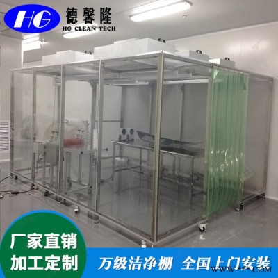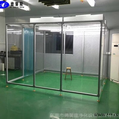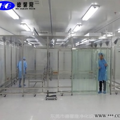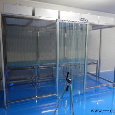 潔凈棚采用工業鋁材(或不銹鋼方通、鐵方通噴塑)作為框架,風機濾網機組(FFU)送風,四周懸掛防靜電垂簾(或鋼化玻璃),其內部凈化級別可達到100-10000級。適用于操作區內局部凈化級別要求高的區域。