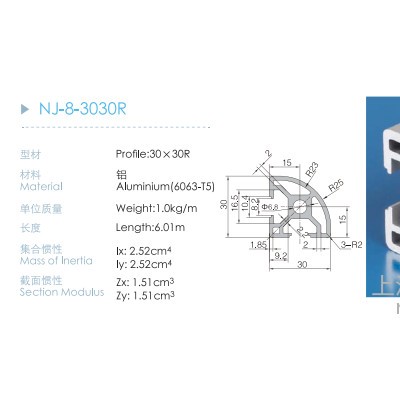 3030R工業鋁型材屬于8mm槽寬工業鋁型材系列,適應于各種框架組合結構,其外型采用圓角過渡,表面經過陽極氧化處理,高雅美觀并且抗腐蝕,它通常采用M6X16高強度專用螺栓內部連接方式,堅固可靠,是工業鋁型材應用最廣泛的型材之一。