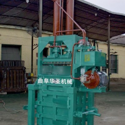 液壓打包機包括支架,支架帶有底板和前后側擋板,支架上安裝有千斤頂,千斤頂帶有活塞桿,活塞桿右端連接有豎直的推料板,推料板右側面連接有推料板條,相鄰推料板條之間的空隙為板上穿繩槽;支架上面右部帶有壓料上擋板,壓料上擋板左側的支架上面帶有進料口;