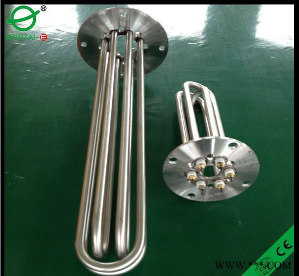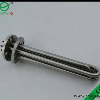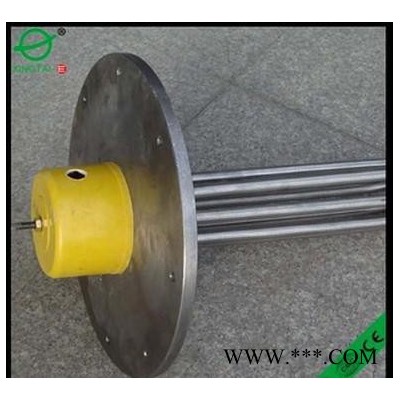 法蘭電熱管:是采用U型管狀電熱元件,依據加熱不同介質設計規范,按照功率配置要求裝配在法蘭蓋上,插入需加熱物料中,發熱元件工作時所發出的大量熱量傳導給被加熱介質使介質溫度升高,達到所需的工藝要求。當介質溫度達到工藝要求的設定值時,控制系統根據溫度傳感器信號,經PID運算后調節電加熱器輸出功率,對發熱元件的電阻性負載實現溫度控制。使介質溫度均勻,達到所需要求;當發熱元件超溫或低液位時,發熱元件的聯鎖保護裝置立即切斷加熱電源避免發熱元件燒壞,延長使用壽命。