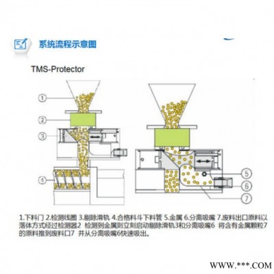 金屬分離器應用電磁感原理來探測金屬。鐵磁類金屬進入探測區域將影響探測區域的磁力線分布,進而影響了固定范圍的磁通,檢測器內部分布著中央發射線圈和兩個對等的接收線圈,通過中間的發射線圈所連接的振蕩器來產生高頻可變磁場,空閑狀態時兩側接收線圈的感應電壓在磁場未受干擾前相互抵消而達到平衡狀態。一旦金屬雜質進入磁場區域,磁場受到干擾,兩個接收線圈的感應電壓**無法抵消,未被抵消的感應電壓產生報警信號(檢測到金屬雜質)。系統利用該報警信號驅動自動剔除裝置等,把金屬雜質排除生產線以外。