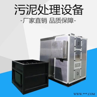 本款污泥低溫箱式干燥機,包括箱體,所述箱體內設置干燥區和功能區,所述干燥區與功能區之間設置隔板,干燥區和功能區之間通過設置在隔板上的送風口和回風口相通;在所述干燥區內設置可拆卸污泥斗,在所述功能區內設置除濕熱泵組件。本發明有如下優點:除濕性能比可達2.0-3.6kg.水/kw.h,相對傳統污泥干化(燃煤)可節能40%以上;相對燃油燃氣節能更多;可直接將板框壓濾機出料直接干燥至30%以下;低溫(40-75℃)全封閉干化工藝,抑制揮發性氣體揮發,可安全運行無尾氣排放,無需臭氣處理系統;采用雙效降溫過程,熱空氣更干燥,干燥速度更快;勞動強度低采用全密封設計,無異味逸出,散熱量少,節約運行費。