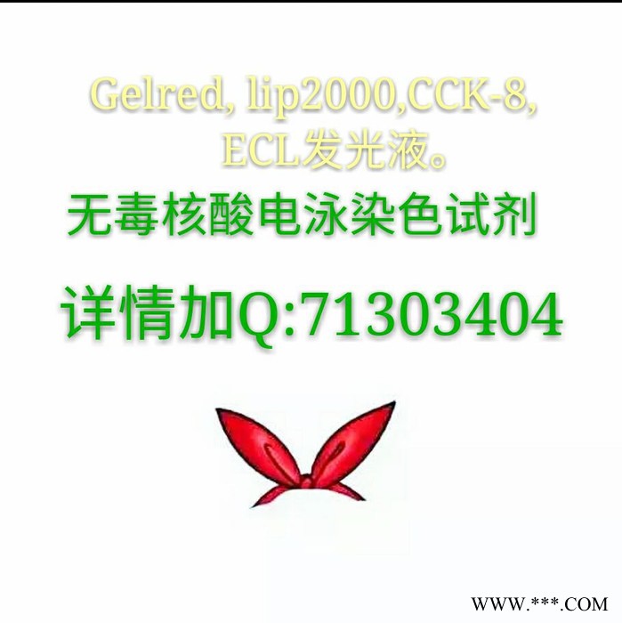 | DuRed(效果同GelRed)核酸染料(10,000× 水溶液) ??DuRed核酸染料特點 聯系QQ71303404 ??● 無毒性:DuRed 獨特的油性和大分子量特點使其不能穿透細胞膜進入細胞內,艾姆斯氏試驗結果也表明,該染料的誘變性遠遠小于EB。 ??● 靈敏度高:適用于各種大小片段的電泳染色,對核酸遷移的影響小于SYBR Green I。 ??● 穩定性高: 適用于使用微波或其它加熱方法制備瓊脂糖凝膠;室溫下在酸或堿緩沖液中極其穩定,耐光性強。 ??● 信噪比高:樣品熒光信號強,背景信號低。 ??● 操作簡單:與 EB 一樣,在預制膠和電泳過程中染料不降解;而電泳后染色過程也只需30 分鐘且無需脫色或沖洗 ,即可直接用紫外凝膠透射儀觀察。 ??● 適用范圍廣:可選擇電泳前染色(膠染法)或電泳后染色(泡染法);適用于瓊脂糖凝膠或聚丙烯酰胺凝膠電泳;可用于 dsDNA、ssDNA 或 RNA 染色。 ??● 與EB有相同的光譜特性,無需改變濾光片及觀察裝置:標準的 EB 濾光片或 SYBR 濾光片都適用,使用與觀察EB相同的普通紫外凝膠透射儀觀察即可,在300nm 紫外光附近可得到**激發。但是DuRed不能被488 nm氬離子激光器或相似波長的可見光完全激發,因此不推薦使用此類激發裝置的成像系統。對于此類裝置,我們推薦您使用DuGreen(Cat# F011),它和SYBR Green I的光譜相似,靈敏度相當,但更加穩定。 ??DuRed使用方法簡介 1.膠染法(用法同EB)(推薦方法) ??(1) 制膠時加入DuRed 核酸染料(例如:每50mL 瓊脂糖溶液中加入5μL DuRed 10,000×儲液,以此比例類推)。 ??(2) 按照常規方法進行電泳。 ??注意事項: ??(1) 此方法染色染料用量相對較少。500 μL染料大約可以做100塊 50mL的膠。 ??(2)由于DuRed具有良好的熱穩定性,可以在熱的瓊脂糖溶液中直接添加,而不需要等待溶液冷卻。搖晃,振蕩或者翻轉以保證染料充分混勻。也可以選擇將DuRed儲液加到瓊脂糖粉末和電泳緩沖液中,然后用微波爐或其他常用方式加熱以制備瓊脂糖凝膠。DuRed兼容所有常用的電泳緩沖溶液。 ??(3) 如果總是看到條帶彌散或分離不理想,建議使用泡染法染色以確認問題是否與染料有關。如果染色后問題依舊存在,則說明問題與染料無關,請嘗試:降低瓊脂糖濃度;選用更長的凝膠;延長凝膠時間以保證邊緣清晰;改進上樣技巧或選擇泡染法染色。 ??(4) 此方法不適合預制聚丙烯酰胺凝膠,對于聚丙烯酰胺凝膠請使用泡染法。 ??2.泡染法 ??(1) 按照常規方法進行電泳。 ??(2) 用H2O將DuRed 10,000× 儲液稀釋約3,300倍到0.1M NaCl中,制成3× 染色液。(例如將15μL DuRed 10,000× 儲液和5mL 1M NaCl加到45mL H2O中)。 ??(3) 將凝膠小心地放入合適的容器中,如聚丙烯容器中。緩慢加入足量的3× 染色液浸沒凝膠。室溫振蕩染色30min左右,**染色時間根據凝膠厚度以及瓊脂糖濃度不同而略有不同。對于含3.5~10%丙烯酰胺的凝膠,染色時間通常介于30min到1h,并隨丙烯酰胺含量增加而延長。 ??注意事項: ??(1) 用泡染法染色時,染料用量較多。單次使用的染色液可重復使用3次左右。 ??(2) 3× DuRed染色液可以大量制備,在室溫下避光保存直至用完。 幾種核酸染料比較