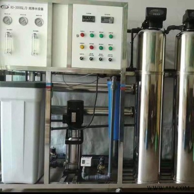 原水 → 原水箱 → 原水泵 →多介質過濾器 (石英砂過濾器)→活性炭過濾器 →軟水處理器 → 精密過濾器 → 高壓泵 → 一級反滲透(RO)裝置 → 純凈水箱 → 高壓泵→二級反滲透→紫外線殺菌裝置 → 用水點