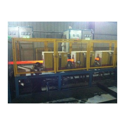 通過輥道將料棒輸送到中頻感應加熱爐中連續加熱,料棒在輥道上繞自身軸線轉動可使加熱更均勻;根據料棒材質的不同,達到一定的溫度后,輥道將料棒輸送進入淬火裝置,在料棒四周向料棒進行噴淋淬火處理;