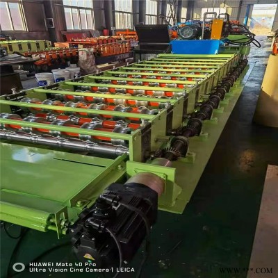 800壓瓦機成型采用同步壓,9排軸成型,板成型平整,無皺折、無劃漆現象;機身采用250mms槽鋼焊接,中板采用14mm鋼板焊接(寬298mm);軸采用45#鋼熱處理加工,軸徑φ70mm,模型輪采用45#鋼加工成型,模具輪直徑130mm,表面鍍硬鉻;傳動采用6分鏈輪鏈條傳動(內掛式),4#3kw行星擺線式減速機,運動平穩,無噪音;中板連接采用鑄鋼拉板,確保機器在壓制厚板時,不發生變型;傳動軸承采用 哈爾濱6210高速雙密封軸承、免維護,以延長機器運轉壽命;剪切液壓系統采用CDF-10齒輪泵,無噪音運行平穩,使用壽命長,液壓泵站采用3kw;電腦控制系統采用智能臺達工業電子編程器PLC三晶變頻器控制系統,控做簡單、精度準確,誤差2mm以內,性能穩定;原料支撐架采用人工調節試,操做簡便;適用0.27mm-0.8mm的彩涂板或鍍鋅板;設備重約2000kg,機器長約5000mm*寬1300mm*高1000mm,出板速度8-12米/分鐘。